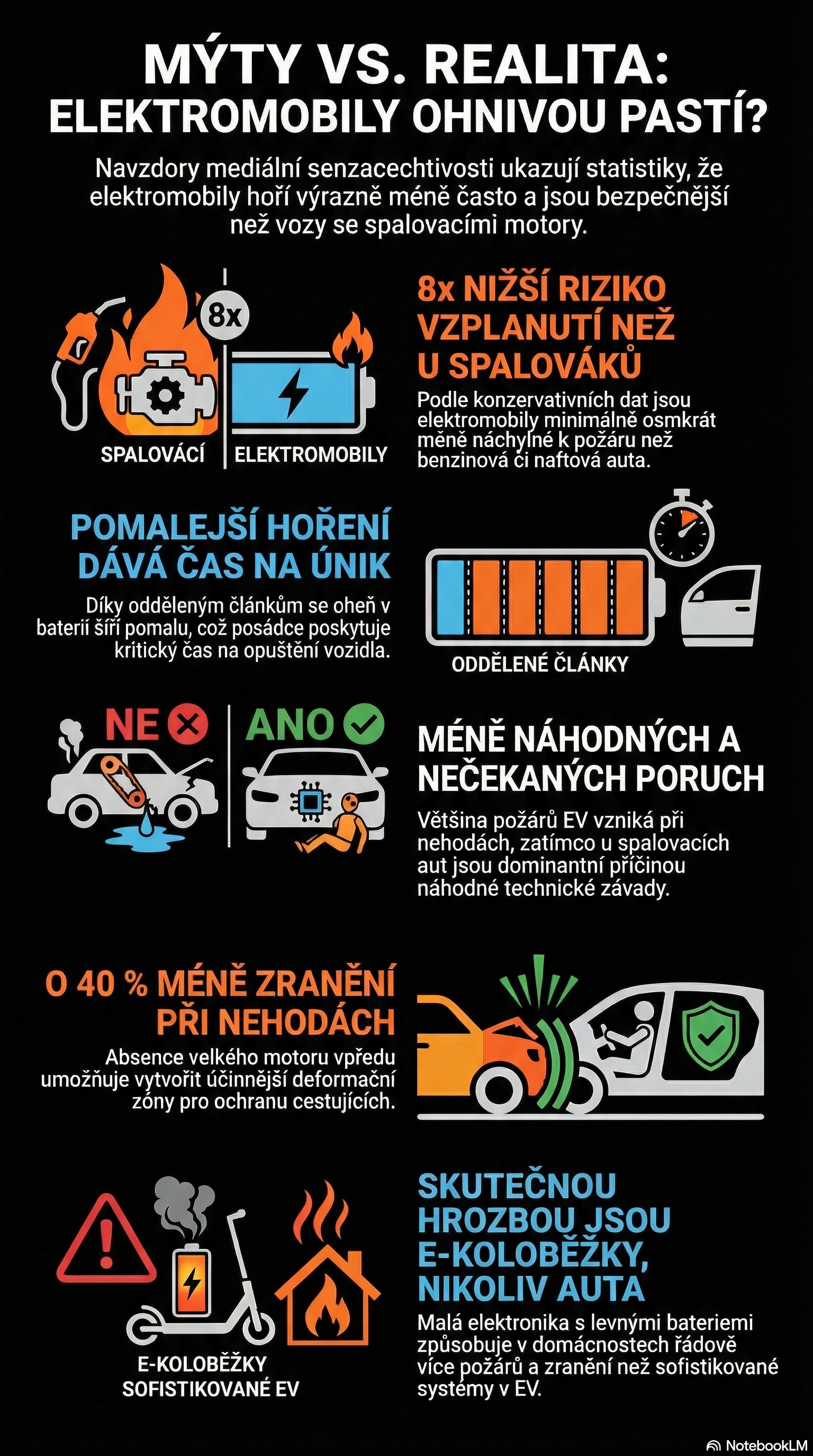 Elektromobily nejsou časované bomby, jak si mnozí myslí. Data ukazují, že hoří až 8x méně než auta se spalovacím motorem. Jak je to možné? A proč tomu pořád většina nevěří? Podívejte se na video a zjistěte, jak to opravdu je.